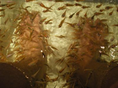 Also es gibt diverse Cafes in denen man nen leckeren Snack zu sich nehmen kann, oder/und eben seine Füße bearbeiten lassen kann :) und das ganze von kleinen, glubschäugigen Fischiis.